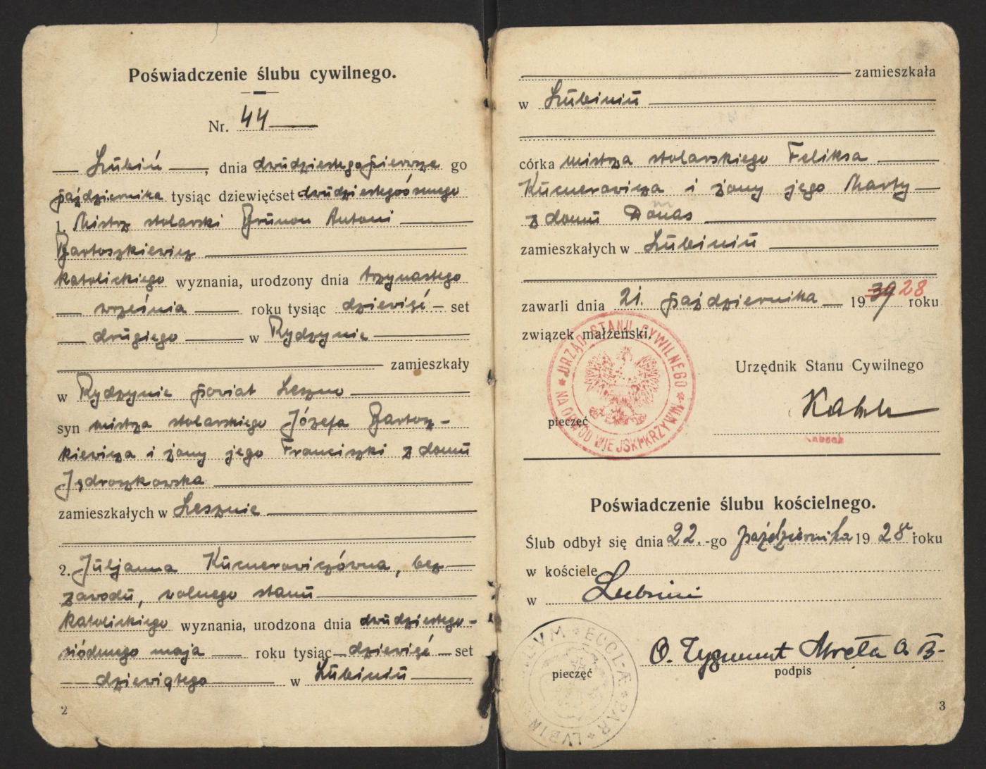 Julianna Bartoszkiewicz z domu Kucnerowicz, córka Feliksa i Marty urodziła się 27 maja 1909 r. w Lubiniu, w powiecie kościańskim. Jej ojciec prowadził w Lubiniu zakład stolarski, a matka sklep kolonialny. Brunon Bartoszkiewicz urodził się 13 września 1902 r. w Rydzynie, w powiecie leszczyńskim. Jego rodzicami byli Józef i Franciszka Bartoszkiewicz. Ojciec Józef był stolarzem i prowadził w Rydzynie zakład stolarski.