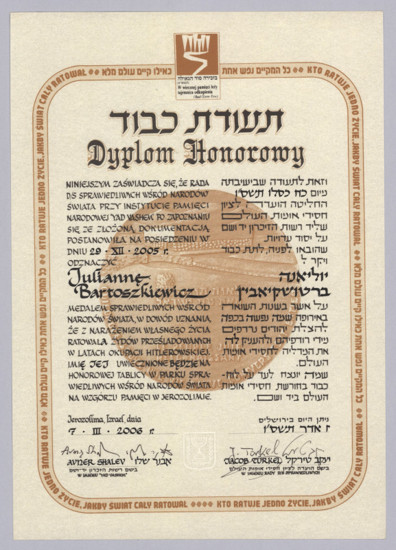 Jerozolimski Instytut Pamięci Yad Vashem na wniosek Estery Waldeman nadał pośmiertnie Juliannie Bartoszkiewicz tytuł ,,Sprawiedliwy wśród Narodów Świata” za uratowanie życia jej i jej mężowi. Medal i dyplom odebrała córka Krystyna z rąk attaché kulturalnego przy Ambasadzie Izraela, Yaakowa Finkelsteina, w siedzibie Filii Związku Gmin Wyznaniowych Żydowskich w Poznaniu, 11 stycznia 2007 r.