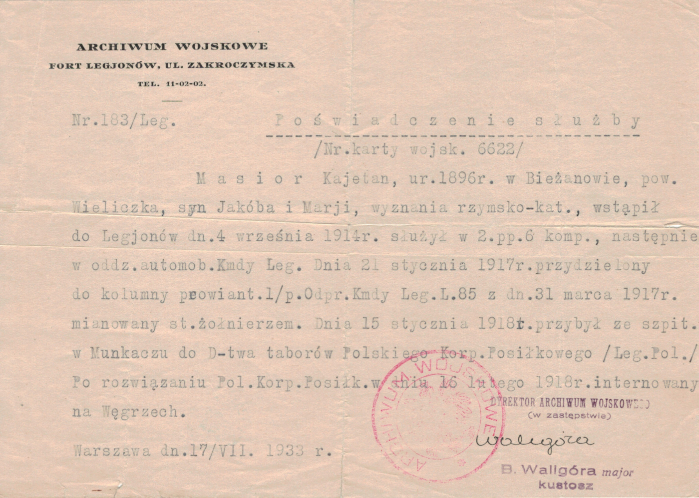 W ramach projektu „Archiwa Rodzinne Niepodległej” Archiwum Narodowe w Krakowie udostępnia kopie wybranych archiwaliów Pani Marii Masior. Dotyczą one głównie Kajetana Masiora, ur. 21 stycznia 1896 r. w Krakowie żołnierza (starszego szeregowego, podoficera rachunkowego) Legionów Polskich (2. i 3. Pułku Piechoty, Dowództwa Taborów, Oddziału Automobilowego, Kolumny Prowiantowej).