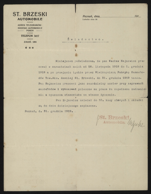 W latach 1918–1919 pracował jako monter przy naprawach samochodów w zakładach w Poznaniu.