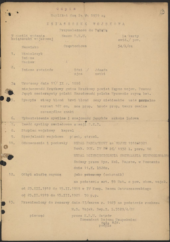 Wacław Michalczyk, syn Idziego i Józefy (z domu Latusek), urodził się 11 września 1896 r. w miejscowości Krążkowy, w powiecie Kępno.